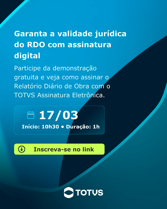 Chega de correr atrás de assinatura no canteiro de obras! O TOTVS Construção Obras e Projetos apresenta uma novidade que promete facilitar a rotina dos profissionais da construção civil: o webinar sobre a Assinatura Eletrônica do Relatório Diário de Obras. O evento ocorrerá no dia 17 de março às 10h30, em um formato online e gratuito, oferecendo uma oportunidade imperdível para clientes e usuários do TOTVS.