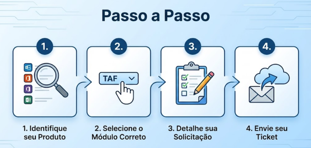 Para garantir que suas dúvidas sobre o TAF (Automação Fiscal) sejam direcionadas imediatamente para os especialistas corretos, preparamos um guia rápido de abertura de tickets.