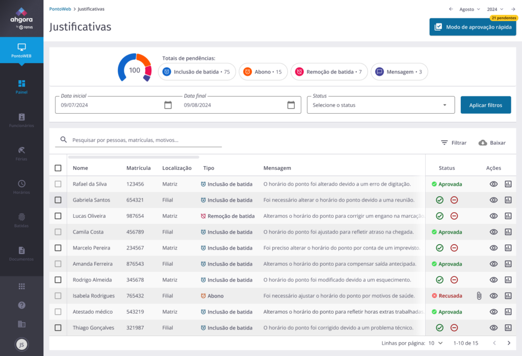 Fique ligado! Até o final de março o novo módulo de justificativas do Pontoweb estará em produção! Com mais informações, ações centralizadas e novas funcionalidades, o RH e gestores poderão visualizar facilmente solicitações por tipo e status, além de mensagens dos funcionários. A nova tela melhora a usabilidade, permitindo aprovação, reprovação e acesso ao espelho de ponto diretamente no módulo. Com novos dados, como motivo de recusa, a tomada de decisão será mais eficiente. Além disso, a ferramenta de aprovação e download em massa otimizará o processo.