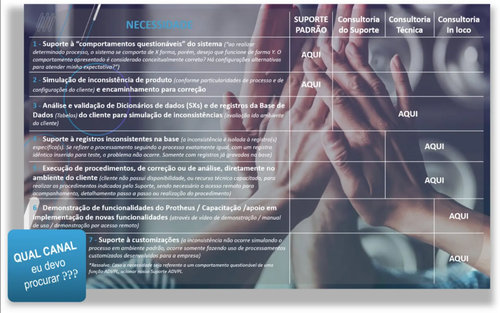 Já se deparou com a mensagem: “Prezado cliente, esta situação não é contemplada no escopo do Suporte padrão” e ficou sem saber qual canal procurar? Vamos esclarecer! Apresentamos as situações mais recorrentes para que você entenda o escopo de atendimento e tome a melhor decisão de forma ágil e assertiva na próxima necessidade.