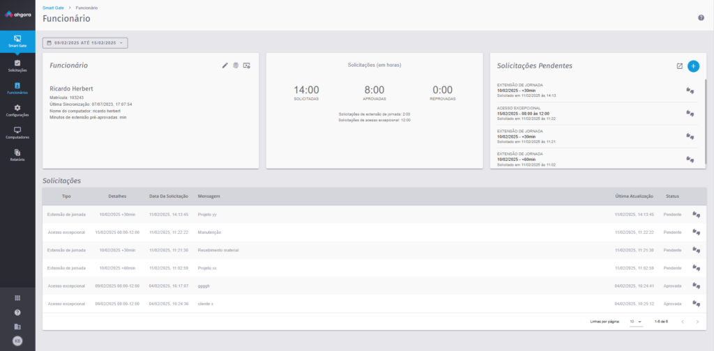 Você já viu a nova tela de dados dos funcionários no Smartgate? Nela você consegue ter um resumo de horas das solicitações do funcionário para o período, fazer solicitações, aprovações e muito mais. Acesse e confira!